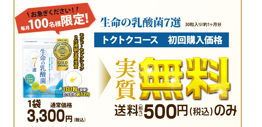 まえから乳酸菌サプリに興味があり、たまたま生命の乳酸菌をネットで見つけて初回30日分が送料のみの無料で試せるとのことでしたので購入しました。ちょっぴり便秘体質だったのですが、生命の乳酸菌を試し始めて半月くらいからお通じは明らかによくなってきました。ちなみに1日1粒を推奨しているのですが、それだと最近はお腹が緩くなりすぎてしまう日もあるので今は3日に2粒にしています。