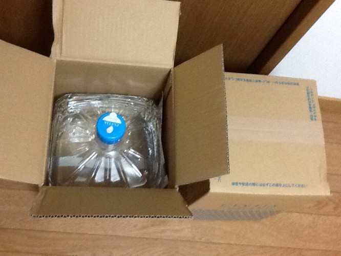 形状が歪まないように、ボトルは段ボールに入ってやってきます。ボトルの底には持ち手が付いているので、付け替えも私一人でもできるのがいいですね。