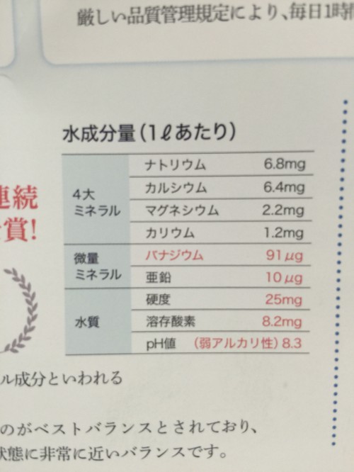 バナジウムと亜鉛を含み4大ミネラル成分といわれるカルシウム、マグネシウム、カリウム、ナトリウムをバランス良く含んでいるんです。